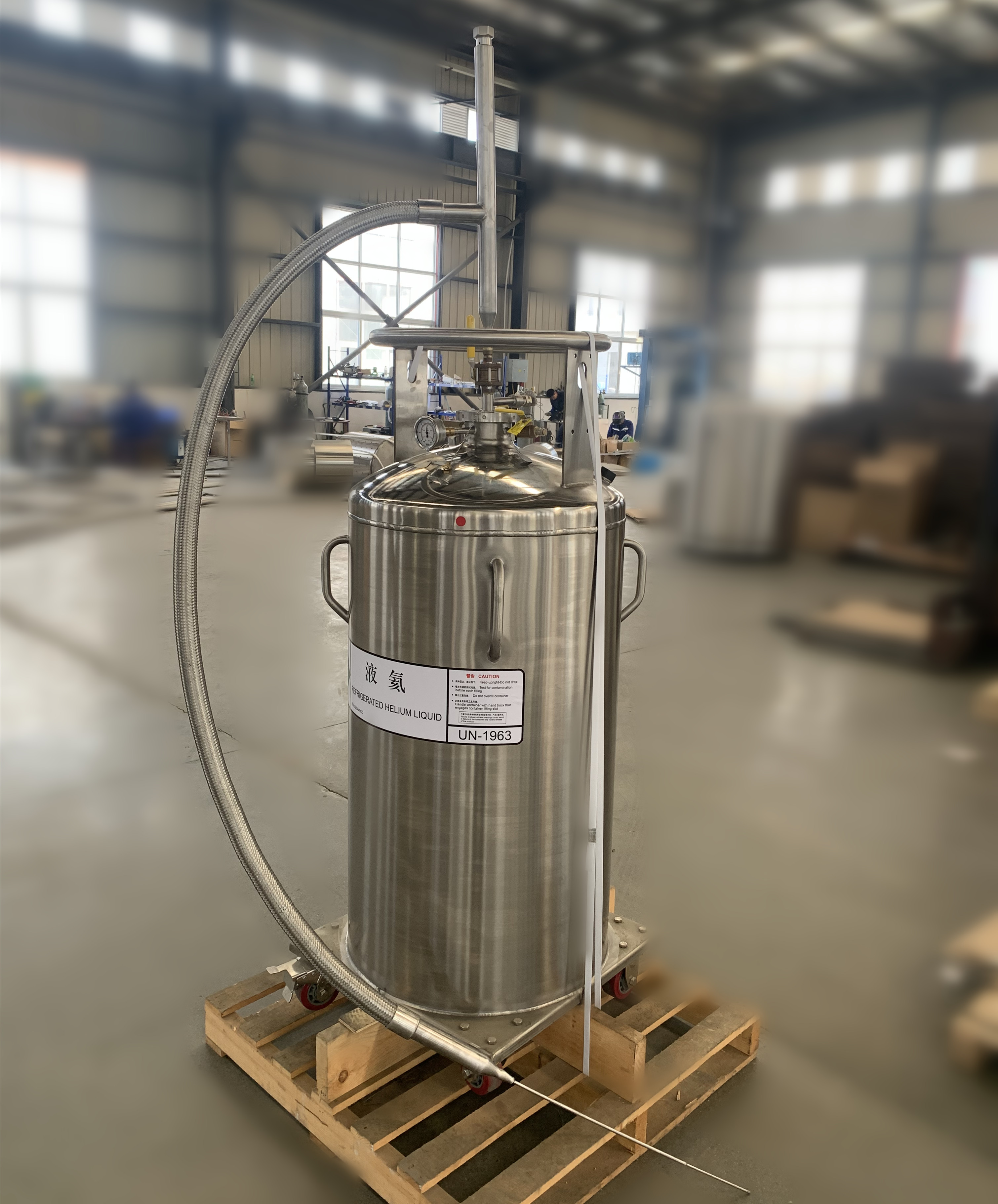 主要用來從大型液氦杜瓦瓶傳輸液氦至小型液氦杜瓦瓶,或者從用液氦杜瓦瓶為核磁做補液使用。根據客戶具體用途定制柔性管路和硬管具體長度。